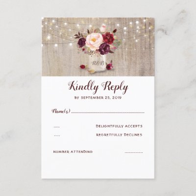 Marsala flowers mason jar and string lights rustic wedding reply cards