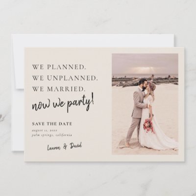 2020 was a year of planning re-planned and rescheduling your wedding plans. Some couples even decided to keep their wedding date to marry and plan their reception for another date. This Post Wedding Save the Date is perfect to announce your new Wedding Reception date. Color is Creamy tan however you can customize the background to your favorite color and edit the text. Back of the card is an optional plaid or you can delete to add photos and more text. For inquiries about custom design changes by the independent designer please email [--]) BEFORE you customize or place an order. Gorgeous stock photo courtesy of Jonathan Borba from Pexels mySaveThe