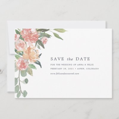 Our Midsummer Floral save the date card features your key wedding details (names wedding date location and website) accented by pastel watercolor flowers and foliage in soft shades of blush pink peach ivory and sage green. A modern and elegant save the date design that's a chic minimalist take on the watercolor floral trend. mySaveThe