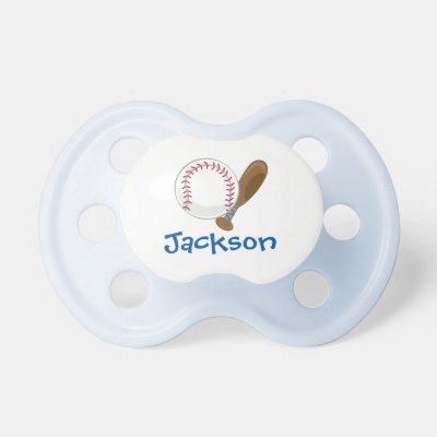 A cute baseball and bat illustration is featured on this custom pacifier. Perfect for a little boy sports fan. Easily personalize by adding a name! Illustration by © Sanqunetti Design myKidsSports