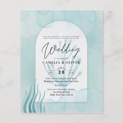 Congratulations on your engagement. Subtle sea glass aqua blue and green watercolor abstract wash with seaweed coral arch design overlay text and text fields both sides to add all your required details. Perfect for your destination beach ocean sea themed wedding.📌PIN this design to your wedding moodboard on Pinterest and enjoy your wedding planning journey. This item is one of many in a wedding collection that includes a variety of typography layouts. VIEW THE ATTACHED COLLECTION TO SEE THEM ALL. Most of my designs include text template fields on both sides (where allowed by the product) to ensure you get the most value and practical benefit. In the case of invitations and save dates this enables you to include rsvp gift registry wedding website reception details and in the most recent designs a QR scanning code. For other items you can add text or images as required for your event. ⭐Thank you for visiting please visit again soon. ©Design and Text LeahG® [--] - weddingdesignchic.com - budgetweddinginvites.com. myArchWedding