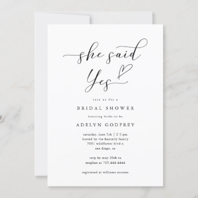 Rustic and minimal bridal shower invitation card featuring script text with a heart at the top that says "she said yes." myBridalShower